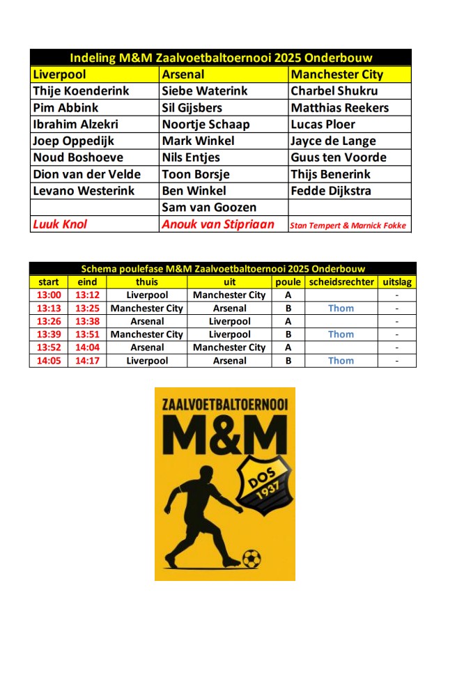 Het M&M-zaalvoetbaltoernooi wordt verdeeld over twee dagen en verschillende leeftijdscategorieën. Via de links is het speelschema en de standen live te volgen: