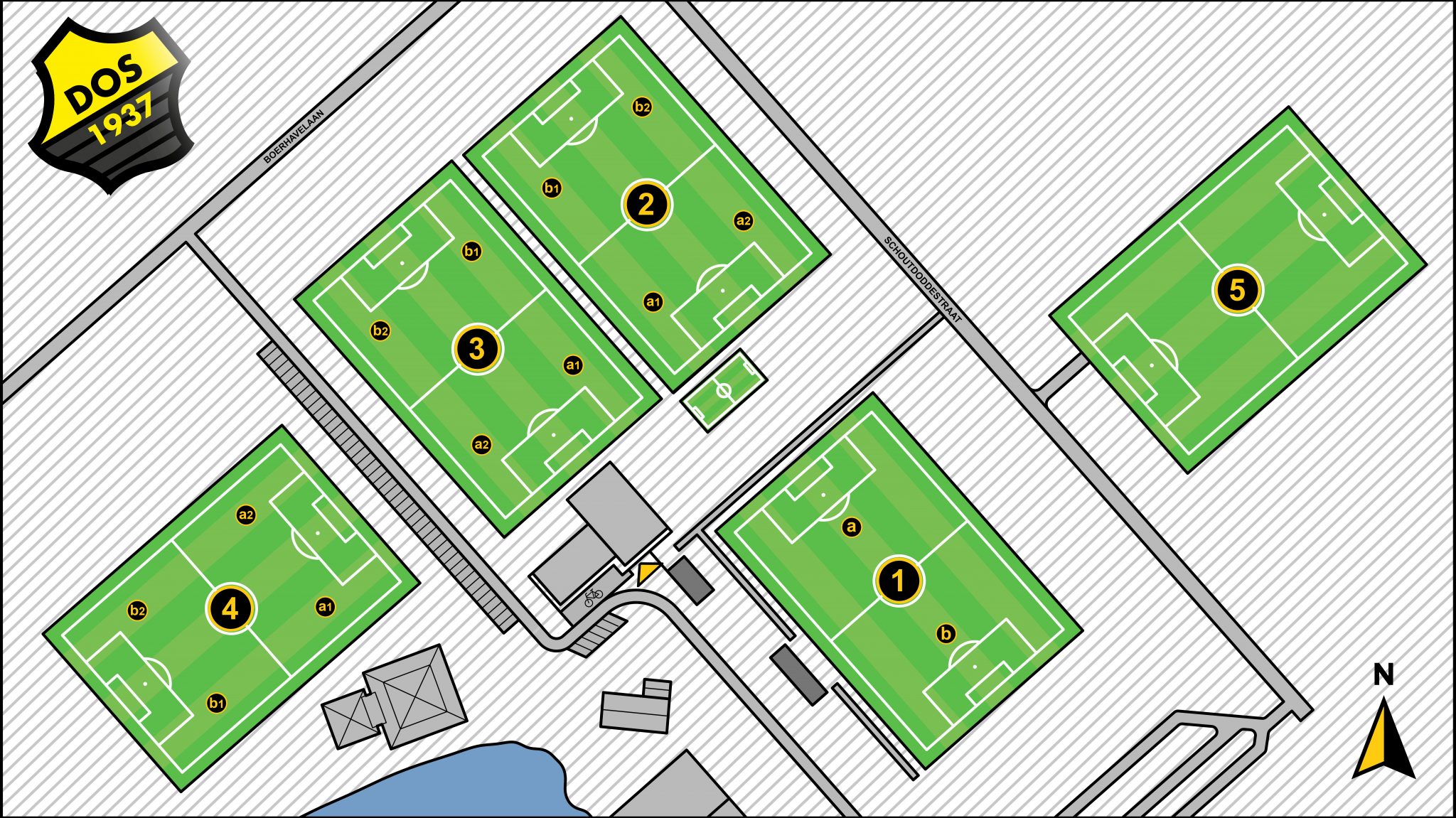 Via de Bouwmeesterstraat: Einde van de Bouwmeesterstraat linksaf richting rotonde, de rotonde recht oversteken, en de derde weg rechtsaf (Krijgerstraat), de 4e weg links (Na het Noordik) (Schout Doddestraat) doorrijden en 2e weg rechts de Boerhaavelaan in. Daarna de 1e weg links. U komt het Sportpark binnen, door blijven rijden tot u bij DOS'37 bent.