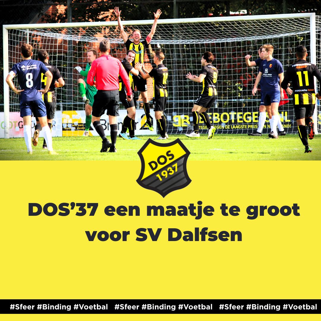 DOS’37 speelde haar eerste thuiswedstrijd tegen SV Dalfsen. Na twee weken zonder competitiewedstrijd op het programma mochten de mannen dan eindelijk weer eens een wedstrijd spelen. Op een mooie zonnige herfstmiddag begonnen de geel-zwarten goed aan de wedstrijd. De eerste mogelijkheid was dan ook voor DOS’37. Een schot van Senna Silva van der Veen gaat maar net voor het doel langs. DOS’37 bleef goed spelen de eerste 15 minuten van de wedstrijd en mochten dan ook het spel maken van SV Dalfsen. Dit leverde in 17e minuut weer een kans op. Dit keer voor Ronald te Morsche. Zijn kopbal werd door de keeper van SV Dalfsen uit het doel weggewerkt. SV Dalfsen kwam niet echt in de wedstrijd voor en had het moeilijk tegen het goed spelende DOS’37. In de 23e minuut werd het dan ook 1-0 voor de thuisploeg. Een mooi opgezette aanval over de rechterkant. Glenn Jansen werd diep gestuurd en zijn voorzet belandde op het hoofd van Ronald te Morsche. Hij kopte de bal met een snoekduik in de touwen, 1-0. Een mooie voorsprong voor DOS’37.