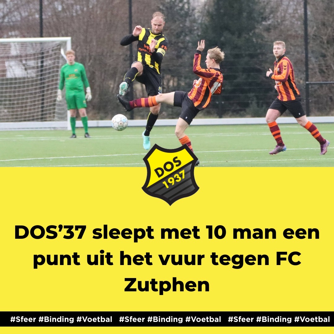Met hernieuwd vertrouwen ging DOS’37 op zoek naar meer. Een lange uittrap van Michel Drent belandde via een gelukkige stuit bij Koen Nijkamp, die koel afrondde en de thuisploeg met 10 man op een 3-2 voorsprong zette. Het leek een stunt in de maak, maar FC Zutphen sloeg genadeloos terug. Een schitterend genomen vrije trap, waarbij de bal strak in de kruising vloog, bracht de stand in de slotfase op 3-3.