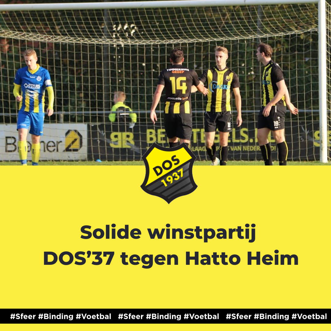 Vriezenveen - Na drie weken niet op eigen veld te hebben gespeeld, keerden de mannen van Gerard Kocks en Wilmar Nieuwenhuis afgelopen zaterdag terug op Het Midden voor een thuiswedstrijd tegen Hatto-Heim. Met de herstelde Patrick Nitert weer onder de lat wist DOS'37 het spel vanaf het begin te domineren. De wedstrijd eindigde in een verdiende 2-0 overwinning voor de thuisploeg dankzij treffers van Koen Nijkamp en Senna Silva van der Veen. Een belangrijke zege, waarmee DOS'37 zich verzekerde van versterking van de koppositie in de tweede klasse H.